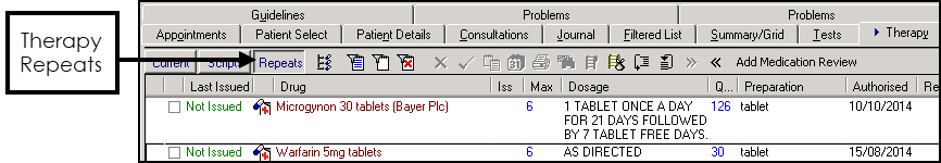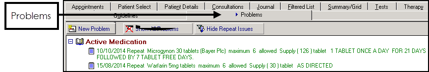 , select the patient required and open a consultation if necessary. - Select either Therapy - Repeats or Problems - Active Medication: