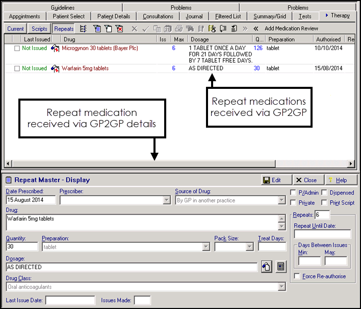 Repeat medication received via GP2GP must be reauthorised before it can be issued, as the originating GP and source are not valid, and you may want to review the repeat drug to ensure it complies with your practice protocol. For this reason, when viewed in Therapy - Repeats, imported repeat medication displays preceded with Prescribed out of Practice