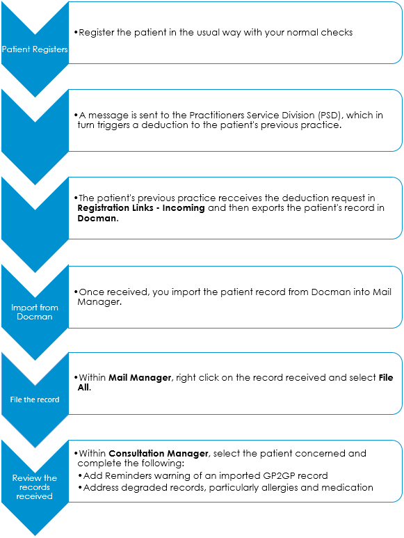 - A warning that it is a GP2GP record and therefore may not conform to your practice protocols.