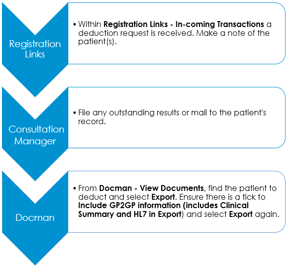 When one of your patients registers with a new practice, you are notified by a Deduction request in Registration Links, complete the following: