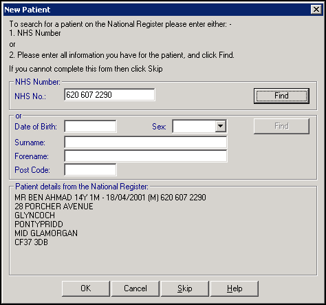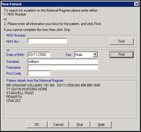 Important - If the patient that displays in the bottom part of the New Patient form is not the patient you require after multiple searches, select Skip to skip the GP2GP process.