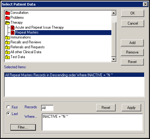 • Therapy Data - Select Patient Data , double click the yellow folder next to Therapy and then the red folder, Repeat Masters. To filter the records returned, in our example we are looking for active repeats only, highlight the line under Selected Items and select Filter. The Criteria Select screen displays, double click Inactive, highlight No and select OK and then OK again: