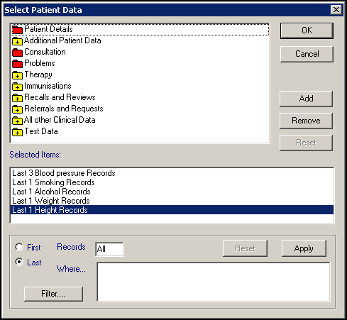 • Prevention Data - Select Patient Data , double click the yellow folder next to All Other Clinical Data, then double click the Lifestyle, finally the red Smoking file. In the lower part of the Select Patient Data screen, select Last and in Records type '1', this returns the last entry of the sort selected. Without selecting OK, double click the red Alcohol file and again select the last one. You can now double click on the yellow folder next to Examination Findings, and repeat the process to add the latest Weight and Height and the latest 3 Blood Pressure readings. Finally select OK and then OK again: