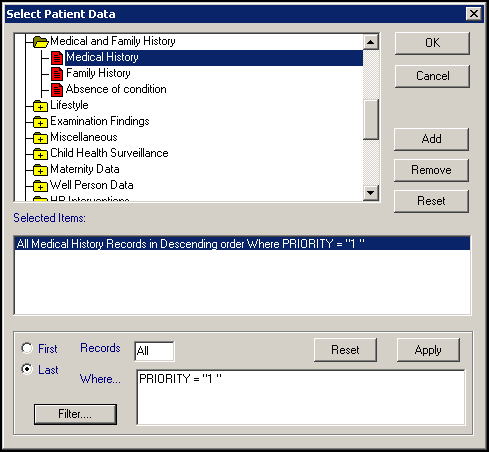 • Significant Past Medical History Data - Select Patient Data , double click the yellow folder next to All Other Clinical Data, then double click the yellow folder next to Medical and Family History and finally the red Medical History file. To filter the records returned, in our example, by Priority, highlight the line under Selected Items and select Filter. The Criteria Select screen displays, double click Priority and with Equals selected enter '1' into From. Select OK and then OK again: