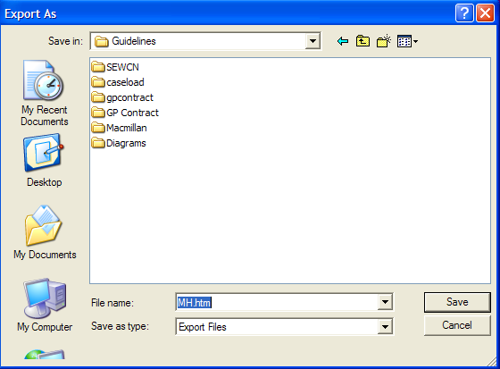 - At the Export As screen, enter a file name up to 8 characters - longer names will be truncated. The extension defaults to .htm and navigate to the drive, path and directory to which you want to export. It will automatically give it a path of \vision\program [guideline name].htm.