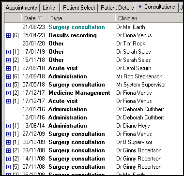 If the Consultation line is highlighted, this shows the number of consultations that a patient has had entered to date.