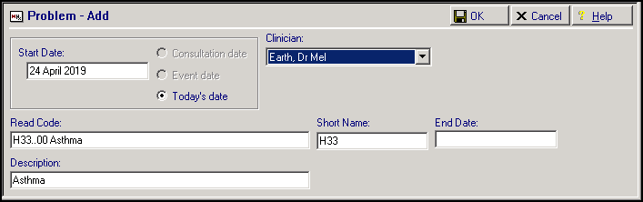 - Read Code - Select a Read term associated with the problem. You can have multiple problems associated with the same READ code, for example H33 Asthma with a mnemonic of ASTHMA, and a second problem with H33 Asthma and NCASTHMA.