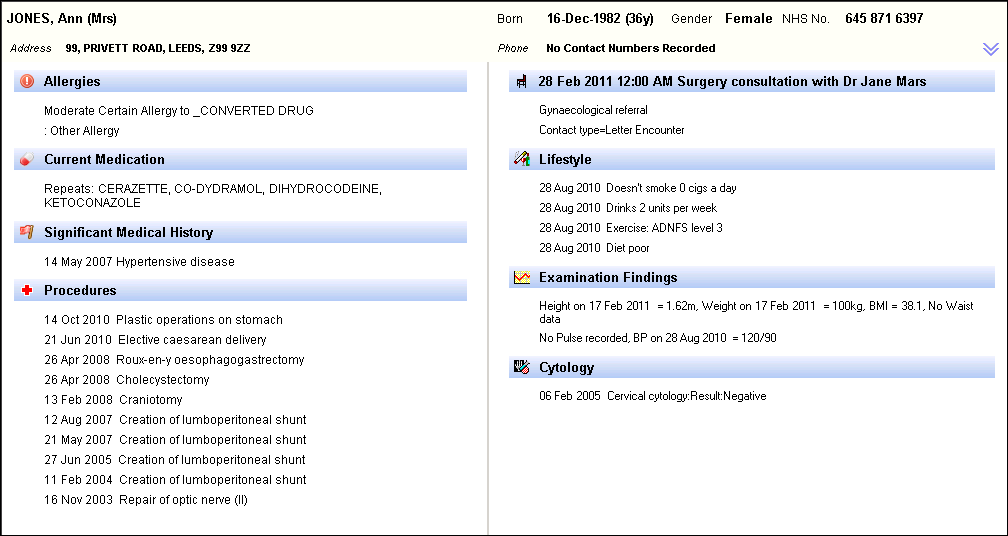The data displays a pre-defined set of criteria and considers the age and sex of the patient. Some items display regardless of whether the information is recorded or not, for example, Allergies is always visible. Other items only show if the patient has the information recorded, for example, Procedures only display if the patient has had an operation or procedure.