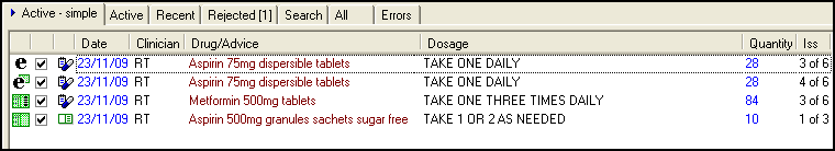 Within Prescription Manager the Active - Simple tab is the simplest tab to display prescription items: