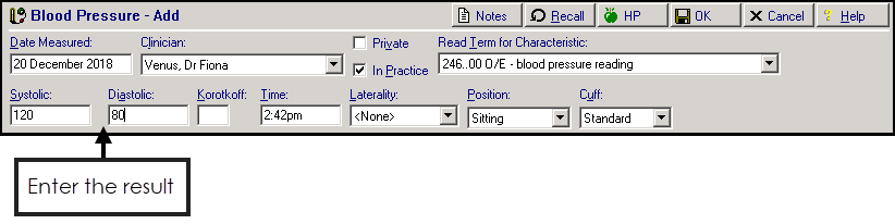 , select the patient required and start a consultation if required. - Select Add - Blood Pressure, remember you can press Alt+A and then Alt+B if using the keyboard.