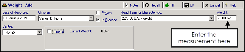 If the patient has an existing height record it displays in metres and the Body Mass Index (BMI) is calculated and displays for reference purposes.