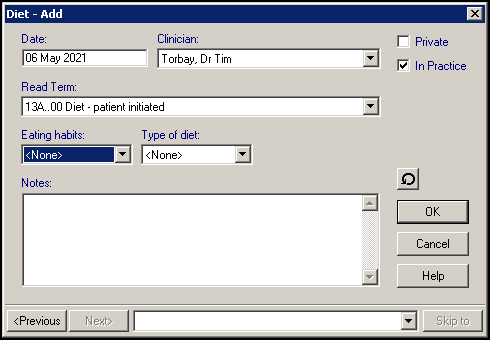 Diet information can also be recorded directly from Read Term - Add, see Adding Clinical Data for details.