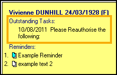 - Close - Hides the yellow reminder. Prescription notes or Outstanding tasks cannot be hidden. Reminders can be re-displayed by selecting View - Reminders.