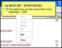 - Right click on any reminder (except prescription notes and tasks which cannot be hidden) and select Close to hide the reminder.