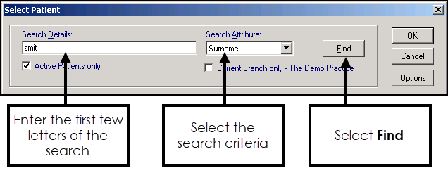 - Search Details - Enter the first few characters of the patient's surname a space and their initial.