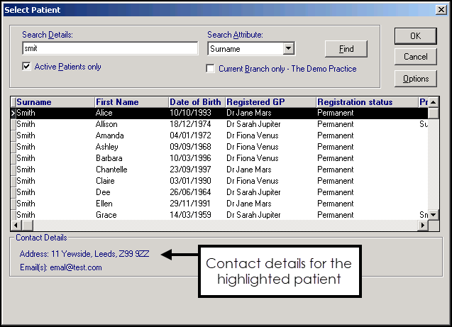Locate the patient you require and either double click on them or highlight the patient required and select OK. Use the right horizontal scroll arrow to view further patient details off-screen on the right.