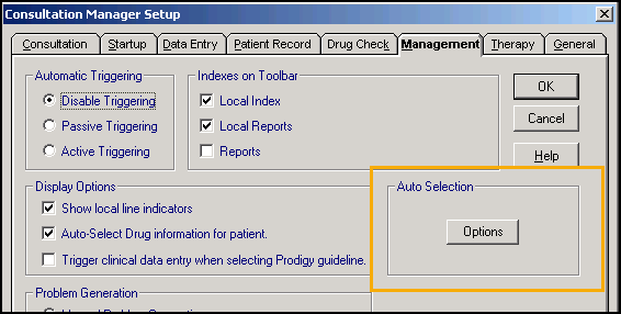 - Select Consultation - Options - Setup - Management and then in Auto Selection select Options: