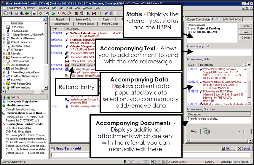 The Referral Message Digest (RMD) enables you to select information to accompany a referral being sent to the e-Referral service (eRS). The RMD displays as a tab in the Consultation Manager consultation pane. It is pre-populated with patient data, see Auto Selection Options for details. You can also add documents, data from structured data areas and add free text to the message.