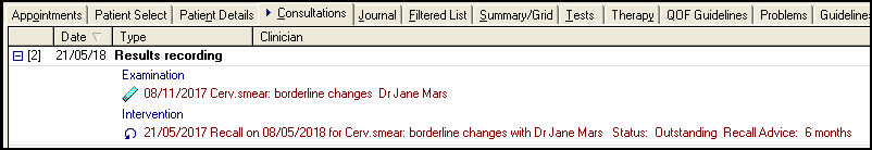 When a SCCRS result message is filed to the patient record in Consultation Manager, the smear result is recorded in the Cervical Cytology Structured Data Area (SDA). The patient has two separate SDA entries:
