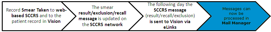 The Scottish Cervical Call Recall System (SCCRS) sends electronic smear results, exclusions and recalls direct to Vision 3 via Mail Manager. These messages can be subsequently filed to the patient record in Consultation Manager.