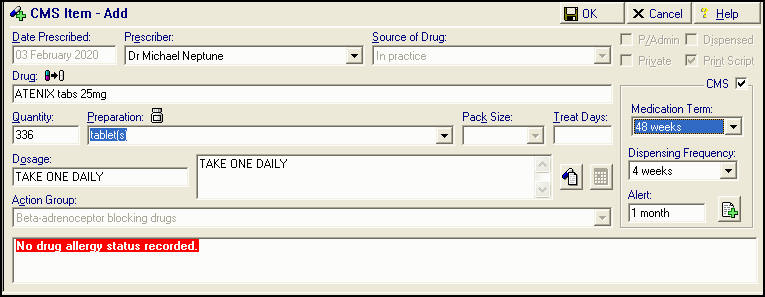 Note - You can set user defaults for Medication Term and Dispensing Frequency in Consultation - Options Set up. See Chronic Medication Service (CMS) Therapy Options for details. - Select OK.
