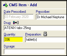 Note - CMS is disabled if any of the CMS exclusions apply, see CMS (Serial Prescribing) Exclusions for details.- Quantity - The total drug quantity is automatically calculated according to the medication term and dosage (obtained from the maximum daily dosage in the Gemscript dictionary).