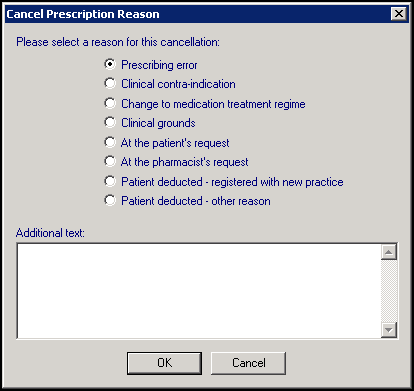 If you are cancelling CMS item(s) which have been printed, the 'You have elected to inactivate one or more printed/sent CMS items. Inactivating a printed/sent item will result in the medication being cancelled. The patient will no longer be able to collect this drug and it will not be possible to reactivate this item. Are you sure you wish to inactivate the selected printed/sent CMS item(s)?' displays. Select Yes and the Cancel Prescription Reason screen displays:
