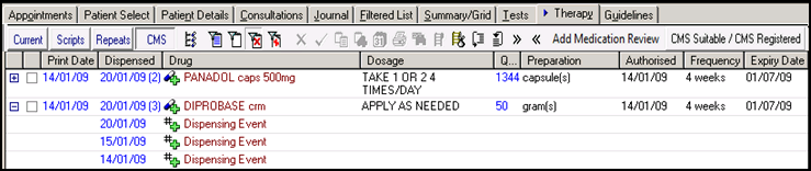 From the Therapy tab, Dispensing events are indicated by