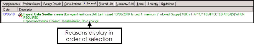 Inactivation and Reauthorisation Change Reasons display in the order they were selected, followed by any additional comments indicated by <<text here>>. For a reauthorisation, the first reason is always Reauthorisation. Recorded reasons display: