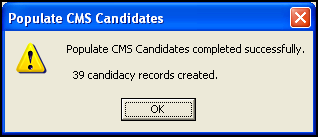- After the population has finished, a confirmation message displays with the number of patients that have been flagged as suitable or unsuitable for CMS: