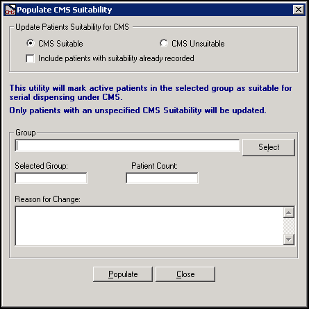 Populate CMS Suitability allows you to mark patients as suitable or unsuitable for CMS within a specific patient group.