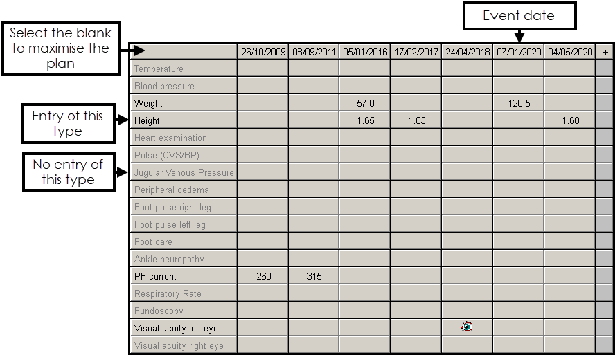 In some cases, such as the Diabetic or Asthma Management Plan, there are several grids within the one plan under different headings of Review, Investigations and Treatment.