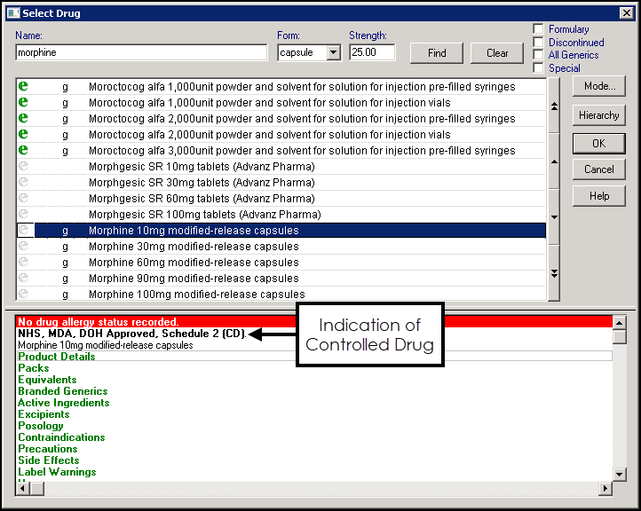 Controlled drugs are marked CD within the product information section of the Select Drug screen: