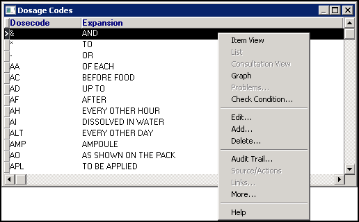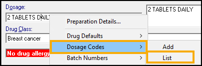 - From the Therapy - Add screen, right click Dosage and select Dosage Codes - List: