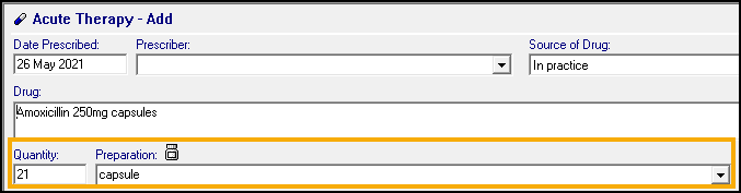 If you have Use Gemscript Posology Defaults selected in Consultation Manager Setup or set up your own therapy defaults, Quantity automatically populates. You can update this as required: