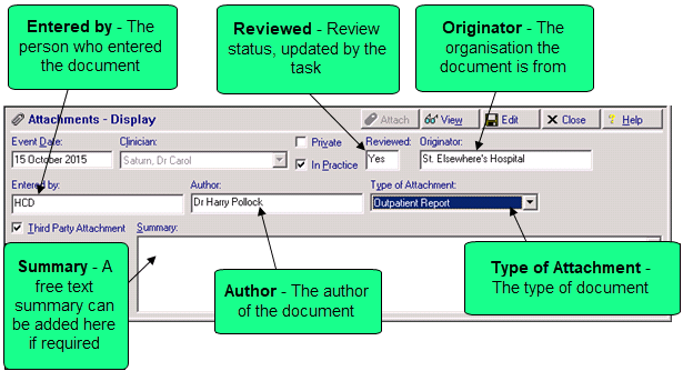 - From Consultation Manager, select the patient required and locate the document.Remember - You can filter your view by selecting the Attachment tab if set up, see Adding an Attachment tab in Consultation Manager for details on how to do this.