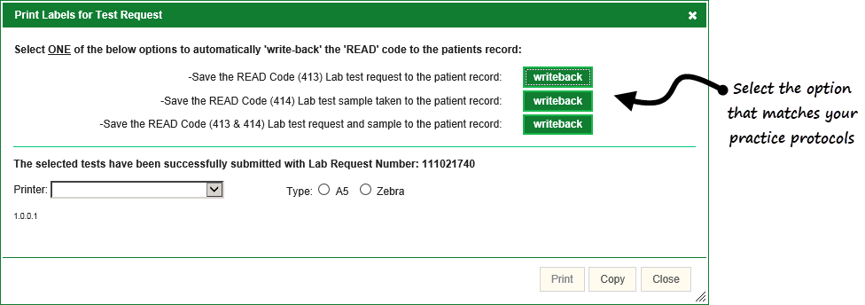 - Once all the details of your request have been completed and you have selected Request, you are offered a choice of writeback options to enable you to write the information back to Vision a way to best fit your practice protocols.