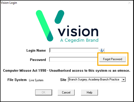1. From the Vision 3 log in screen, enter your Login Name in the usual way and then select Forgot Password: