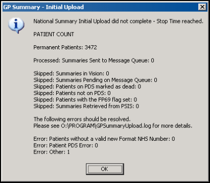 Should the Stop Time be reached before the upload completes, it is recorded in the log file and you are prompted with the upload statistics so far. You will also be informed that National Summary Initial Upload did not complete - stop time reached.
