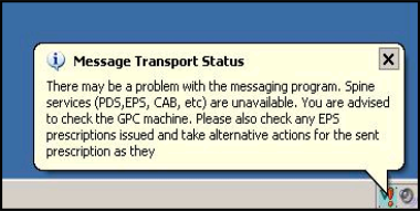 "There may be a problem with the messaging program. Spine services (PDS,EPS,CAB,etc) are unavailable. You are advised to check the GPC machine. Please also check any EPS prescriptions and take alternative actions as they may have not reached the spine."