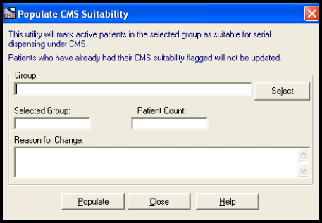 . - A warning message displays, 'This option will mark active patients in the selected group as suitable for serial dispensing under CMS. Please note there is no undo facility. Are you sure you wish to continue?', select Yes to continue.Note - Patients who are already CMS registered are not marked as suitable.