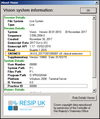 - About Vision - The current version of SNOMED CT installed on your Vision 3 system is now displayed in the About Vision screen: