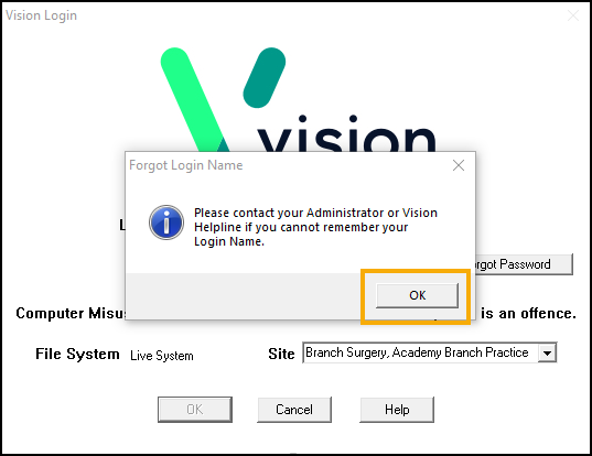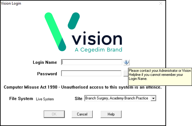 alongside Login Name, hover over it too see the tooltip or select to display the 'Please contact your Administrator or Vision Helpline if you cannot remember your Login Name.' message: