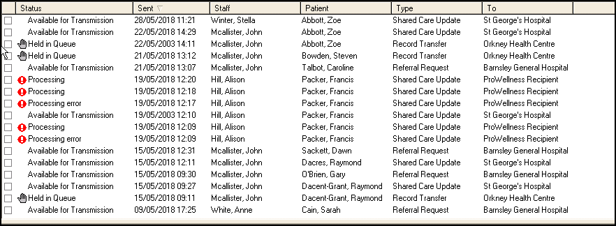 • Held Message - Indicates the message cannot proceed to the next stage without some manual intervention. Some messages may automatically go into a hold state after processing. These require confirmation that the messages can be transmitted. To allow the message to be transmitted, right click and select Unhold message.