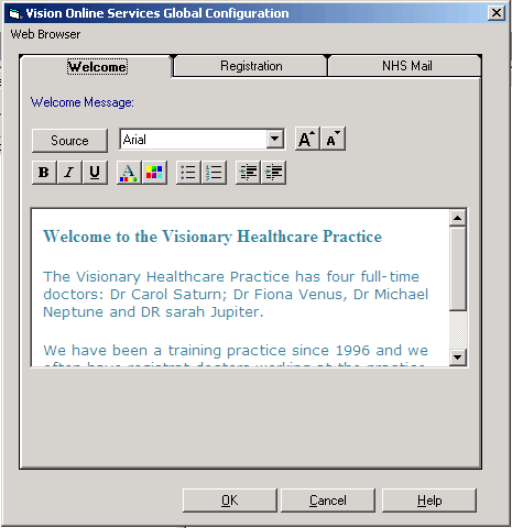 . - Select the Welcome tab to display the Welcome Message displayed on the home page of the website.