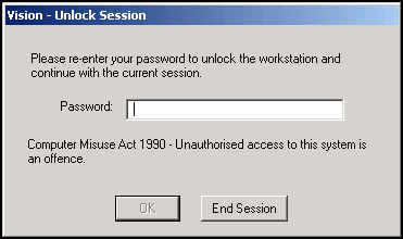 • Select End Session to close Vision 3. Vision 3 closes without displaying any further screens, any open data entry forms are cancelled.