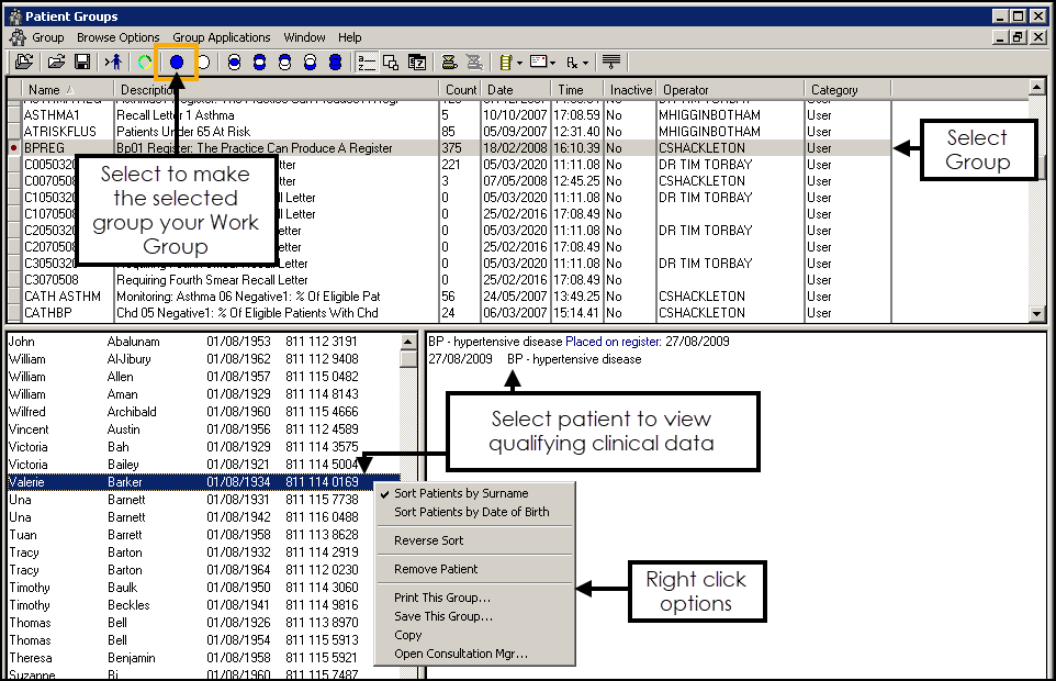 and the list of patients in the group displays. - Right click on the group and select from the following as required: