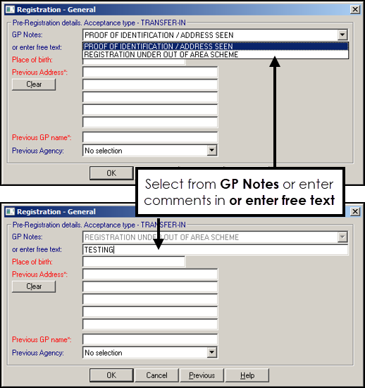 GP Notes - When you register a new patient, the GP Notes section now has a list to select from, or you can enter free text: