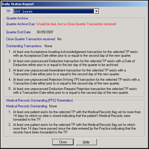 • At least one patient exists for the selected TP with the Medical Record flag set for which more than 14 days have passed since the date entered by the Practice, indicating that the records have been forwarded to the TP - This means that the patient has been removed. You have entered a date in Date Records Sent to TP (more than 14 days ago) and sent the records off. But the HA don't seem to have received them – if they had, they would have removed the Medical Records flag. In Registration - Action, run the report Medical Records not received by TP. Check you have actually sent their records off. If there's a suspicion they have been lost in the post, contact your TP.
