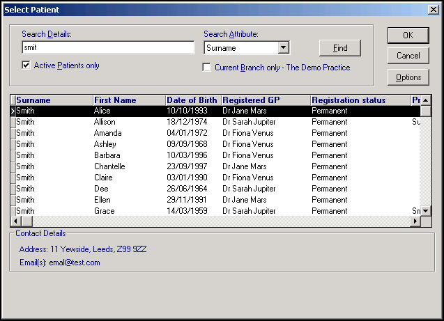 Note - The Active Patients Only tick box and Options are only available on the Select Patient screen if you have rights in Security to view archived patients.